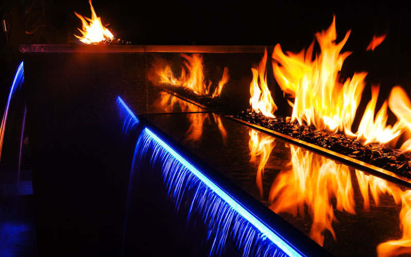 «Poder encender fuego que se puede sentir con el sonido del agua que cae durante la hora del crepúsculo es una experiencia increíble», dice Anthony Santella de Piscina total & Patio.