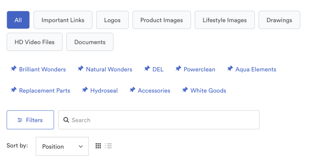 Utilisez la fonction de recherche pour trouver très facilement ce que vous cherchez. De nombreux produits peuvent être recherchés par numéro de pièce. Vous pouvez également trier avec des liens enregistrés en haut de la page Brandfolder et filtrer par type de ressource dont vous avez besoin.