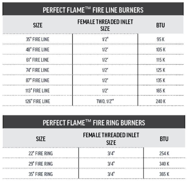 The gas piping shall be installed underground to each fire feature. The piping shall be reduced to 1/2” NPT at each fire feature.