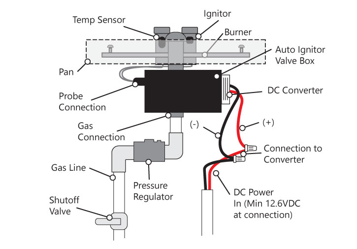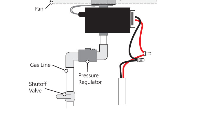 Connect the pressure regulator in line before the Auto Ignitor Box. The regulator should be installed horizontally. The directional arrow should point away from the gas source and towards the gas valve.