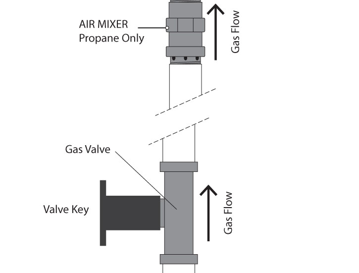 - For the air mixer, be sure to follow specific instructions and make sure the gas is flowing in the same direction as the arrow on the air mixer. Failure to do so could result in personal injury and damage to unit/property.