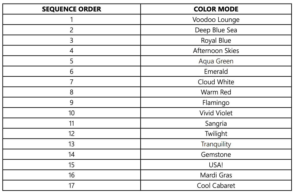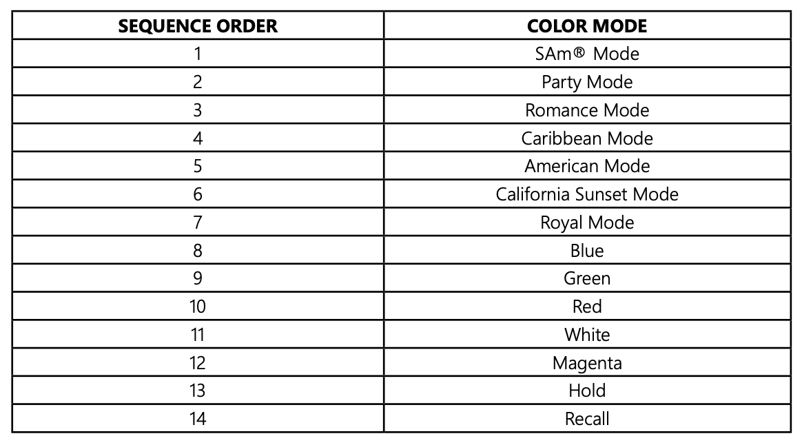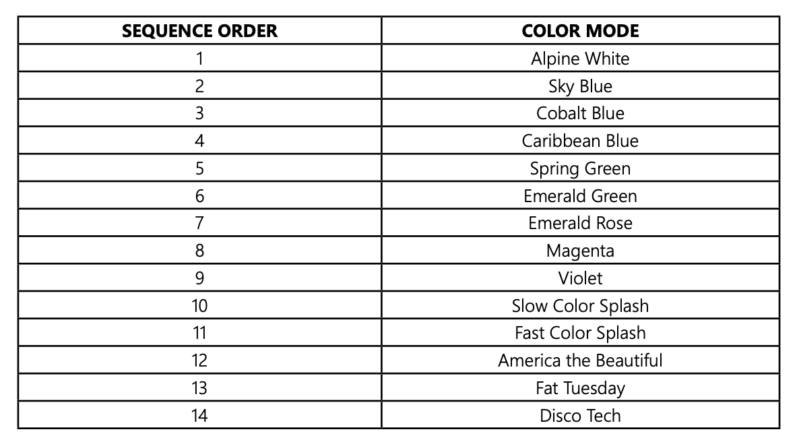 When the light is turned off for more than seven (7) seconds, it will remain in the color mode that was currently active when the light was turned off.