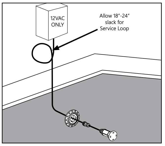 Allow 18″-24″ extra slack in the cord on the 12VAC pool transformer end for future service of the LED light.