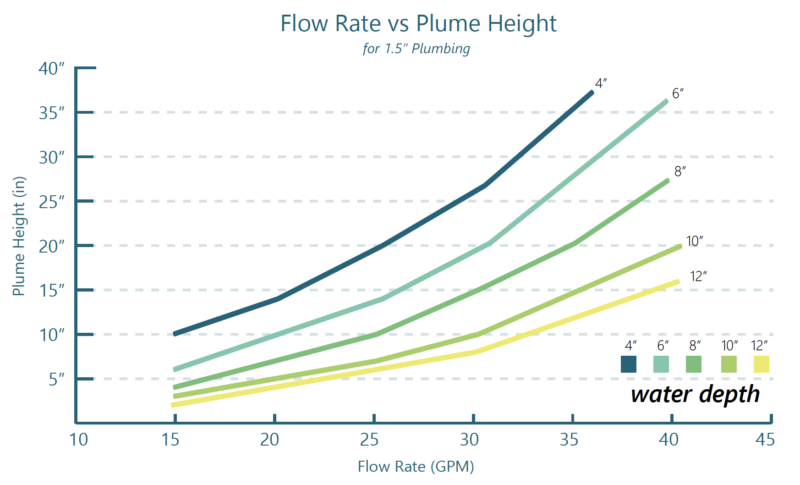 Factors such as water flow rate, orifice size and water depth above the orifice will all contribute to the final look of the plume height. The performance chart below can be used as a reference in deciding how to install your 4″ Bubbler.