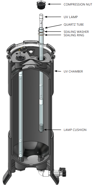 The UV-C 50 Lamps are protected from water by Quartz Tubes sealed into the UV Housing.