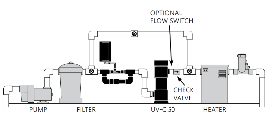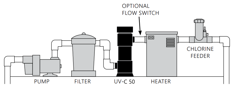 If the UV-C 50 is installed below water level, a Flow Switch Kit (P/N EUV-FS-01) is required to ensure the system does not turn on without adequate flow.