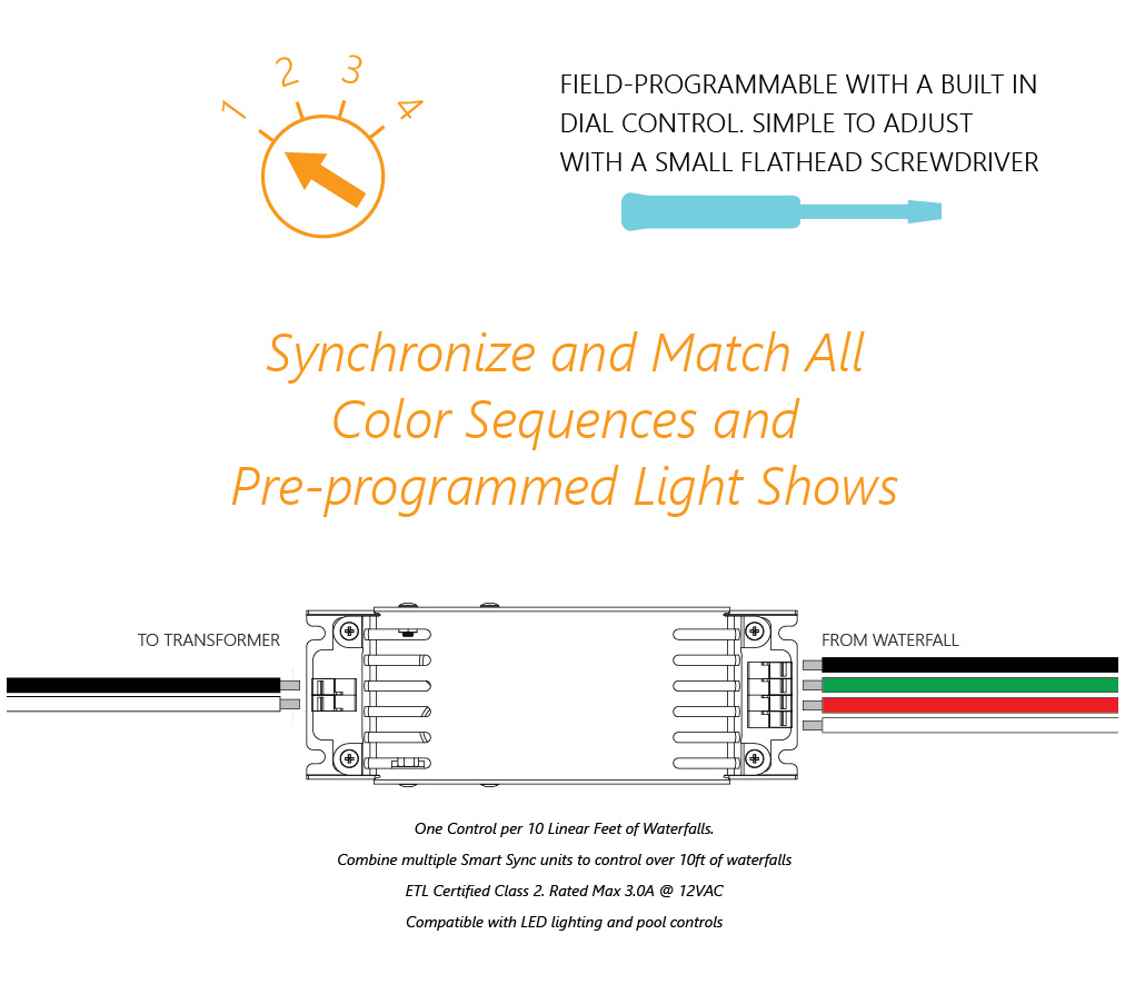 As illustrated in the Smart Sync Install Diagram below, all Smart Sync lighting and compatible controls connected to the same transformer will sync correctly. For multiple waterfalls, simply connect at a junction box before the Smart Sync control. For over ten total feet of waterfalls, use multiple Smart Sync controls in parallel, and connect to the same transformer. Other LED lighting can also be installed in parallel to the same transformer.