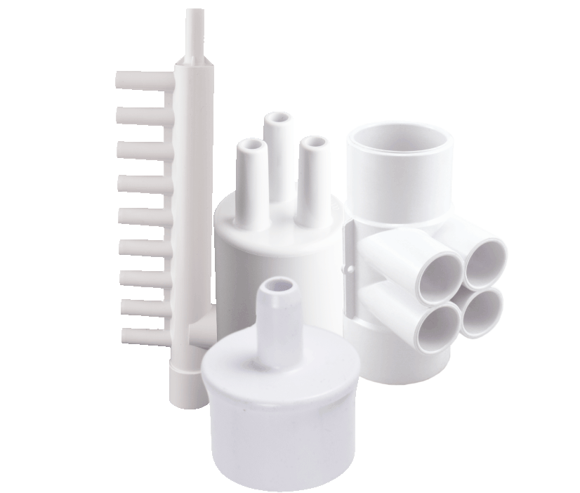 CMP water and air manifolds, including slip water manifolds, ribbed barb water manifolds, smooth barb water manifolds, and air manifold.